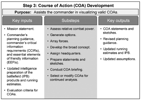 Developing the data collection plan correctly during receipt of mission and mission analysis would generate additional data-driven inputs to aid in COA development. The inputs to development should include the data collection matrix and forces available table, in addition to the augmented CCIR decision support matrix. These updated tools would aid in completing the substeps of relative combat power analysis and the array of forces. As the commander and staff begin to develop courses of action, they should continue to refine the CCIR decision support matrix and data collection matrix.