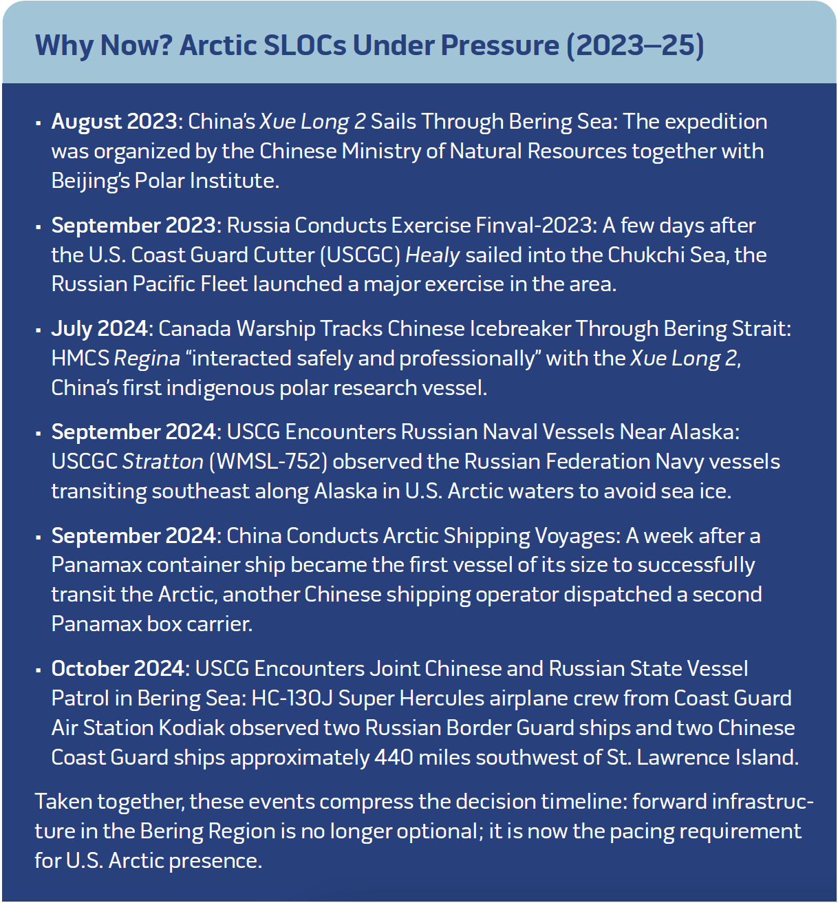 The greatest risk lies in continued inaction. Each year allows Russia to consolidate Northern Sea Route control while China maps underwater terrain through “research” voyages. Arctic contingencies without infrastructure upgrades could force disadvantages involving territorial disputes or navigation restrictions. The above analysis suggests that controlled development at Nome could reduce environmental risk while generating positive economic returns. Moreover, alternative sites face insurmountable obstacles that make them unsuitable for timely SLOC development. Most critical, the strategic risks of inaction far exceed manageable development risks. The question is not whether America needs Arctic infrastructure—but whether it will act before competitors make that choice irrelevant.